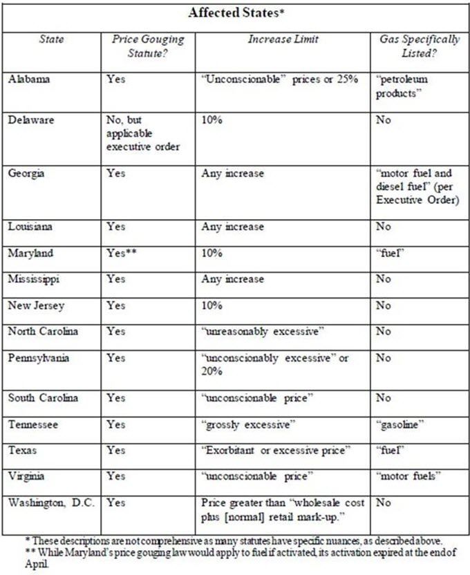 In some places, such as Texas and Tennessee, the price-gouging statutes explicitly cover gasoline or fuel. As a result, the prior COVID-19 emergency declarations could remain the starting point for the emergency, and relevant price limitation considerations could date back much earlier than this cyberattack.